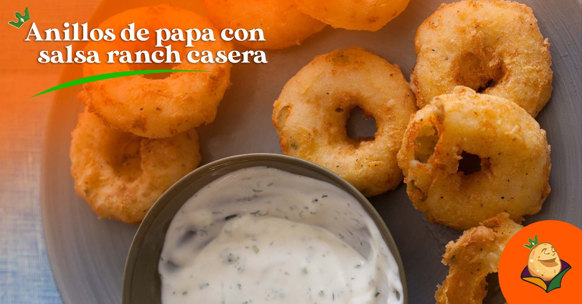 3 papas grandes, limpias, peladas y cortadas en trozos grandes ⅓ taza más 2 cucharadas de crema espesa ¼ taza de mantequilla sin sal (½ barra), ablandada ½ taza de cebollas caramelizadas, picadas 3 cucharadas de cebollino, en rodajas finas ⅔ taza de harina para todo uso ⅓ taza de harina de arroz 2 cucharadas de ajo en polvo 1 cucharada de cebolla en polvo 1 cucharada de pimentón ahumado 2 huevos, ligeramente batidos sal y pimienta al gusto 2 cuartos de aceite vegetal salsa ranchera de suero de leche ½ taza de mayonesa ligera ¼ taza de suero de leche bajo en grasa 1 ½ cucharaditas de jugo de limón fresco 2 cucharadas de perejil de hoja plana, picado 1 cucharada de cebollino, en rodajas finas 1 cucharadita de eneldo picado ½ cucharadita de mostaza seca sal y pimienta al gusto