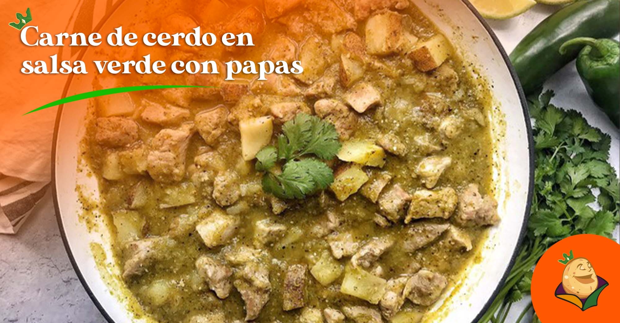 Vierte más aceite vegetal en el mismo sartén en el que preparaste la salsa y una vez caliente, agrega la carne de cerdo y dora hasta sellar. Agrega las papas y vierte la salsa licuada, baja la flama, sazona con sal y pimienta. Cocina a temperatura media-baja por 30 minutos.