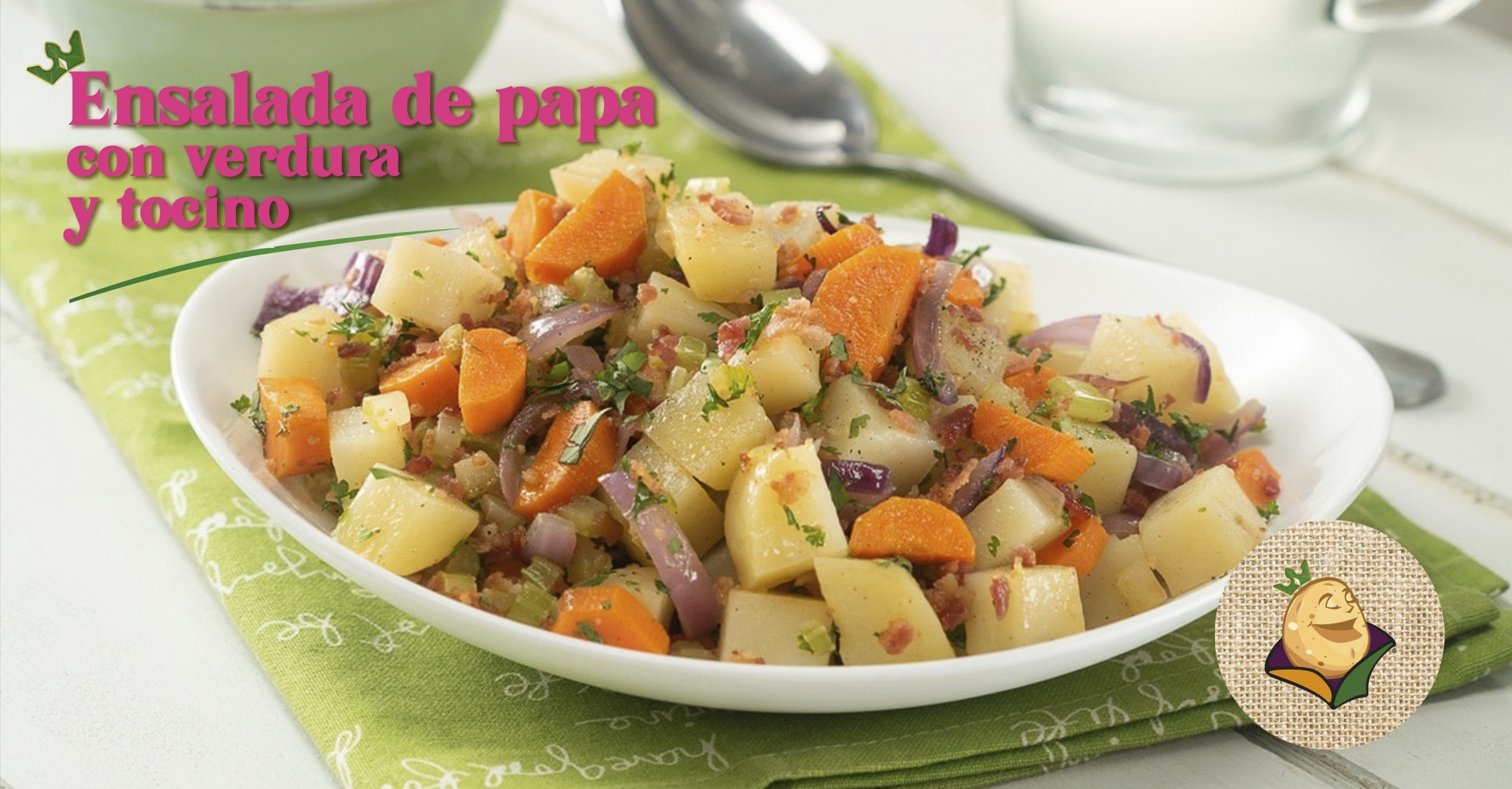 Ingredientes: 1 1/2 tazas de tocino finamente picado 1/2 taza de cebolla morada fileteada 1 diente de ajo finamente picado 1/2 taza de apio finamente picado 1 taza de zanahoria en abanicos 4 papas cocidas en cubos mediano sal y pimienta al gusto 1/2 taza de perejil finamente picado