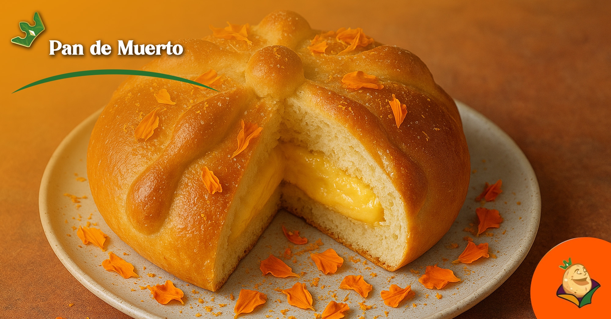 Un pan de muerto esponjoso, fragante, con un relleno suave y cítrico, y una presentación bellísima: dorado, brillante y con pétalos naranjas que evocan el Día de Muertos.