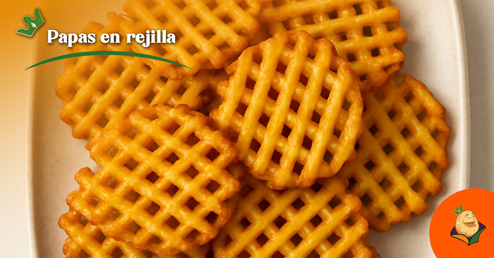 Con una mandolina en modo rejilla (o waffle cutter), corta las papas en rodajas delgadas. Importante: gira la papa 90° entre cada corte para formar el patrón de rejilla.