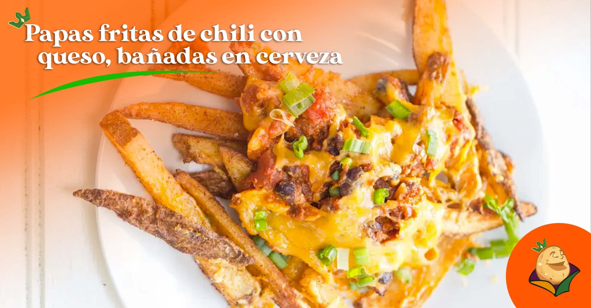 5. Para armar las papas fritas, precalienta el asador. Apila las papas fritas en el medio de una bandeja para hornear, vierte el chile (es posible que no lo necesites todo) y luego espolvorea con queso cheddar. Colóquelo debajo de la parrilla durante 2-3 minutos, o hasta que el queso se derrita. Cubra con cebollas verdes en rodajas y sirva.