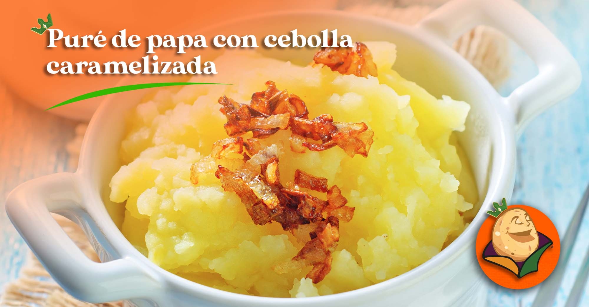 Procedimiento: Precalienta el horno a 200°. Inicia poniendo en una charola para hornear la cebolla cortada en rodajas y marinada con el aceite de oliva y hornéala por 45 minutos o hasta que esté caramelizada. En otra charola para hornear pon las papas cubiertas con papel aluminio (realiza algunos hoyos al aluminio para que se cocinen más rápido). Cocina por aproximadamente 1 hora o hasta que estén tiernas. Después coloca la leche, la mantequilla, la sal y la pimienta en una olla caliente a fuego medio. Cuando las papas estén listas, retíralas del horno y pela su piel con un cuchillo. Agrega las papas cortadas en cubos a la olla con leche y con un tenedor hazlas puré. Para terminar, pon el puré en un tazón y pon sobre las papas las cebollas caramelizadas para decorar y realzar el sabor.